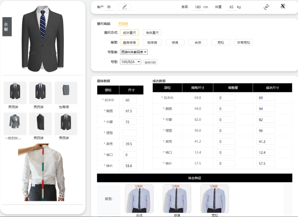 由專業(yè)量體師測量并輸入各個部位的凈體數(shù)據(jù),然后根據(jù)客戶的穿衣習(xí)慣,增加相應(yīng)的放松量,得到成衣數(shù)據(jù)。針對特體部分,拍照并且上傳到系統(tǒng)內(nèi)。最后完成付款下單,